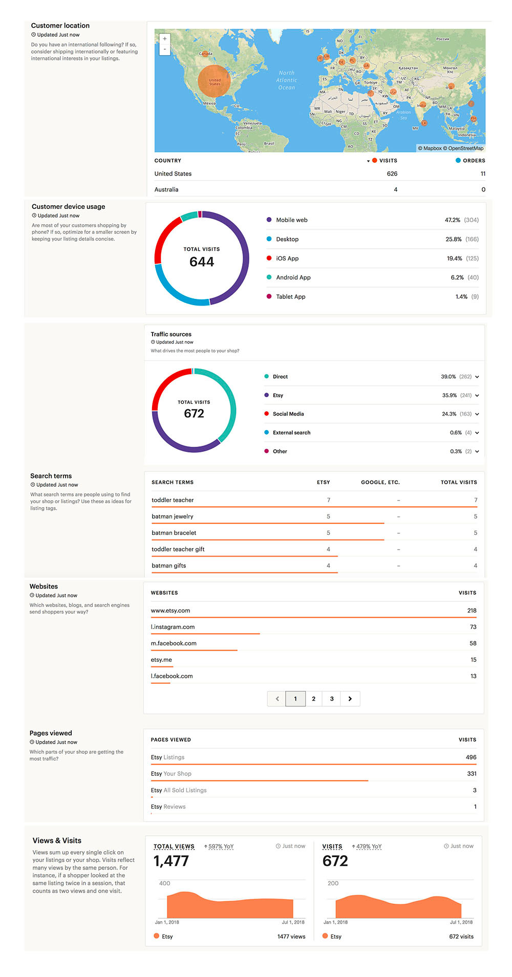 Etsy is a relatively new platform for Seventh + Quinn. We claimed our spot on Etsy when we began so that we could hold our name, but the brand actually began selling on a hosted, stand-alone site. As production was scaled back a few months ago, it moved to an Etsy only platform. Etsy provides many ways to promote your “shop” by way of keywords, SEO, paid promotions, sales, and basic analytics. Consumers on Etsy shop our brand in two ways - Mobile (47%) and Desktop (25%). With the switch from a stand-alone site to Etsy, we have noticed an expected uptick in the manner in which our brand is found. Etsy provides an organic way in which consumers can both find and shop our brand, away from our social media efforts. While Etsy’s free insights suggest that consumers are finding our brand through direct links, we believe the data might still be more reflective of them finding us via social links, rather than an online search, as we currently don’t utilize paid Google SEO.